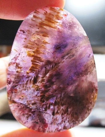 ブラジル産の美しい ”スーパーセブン” 原石をカットし、両面つるつるにポリッシュして平たいフリーフォームに仕上げました。まさにオンリーワンです。とてもすてきでゴージャスなペンダント型です。